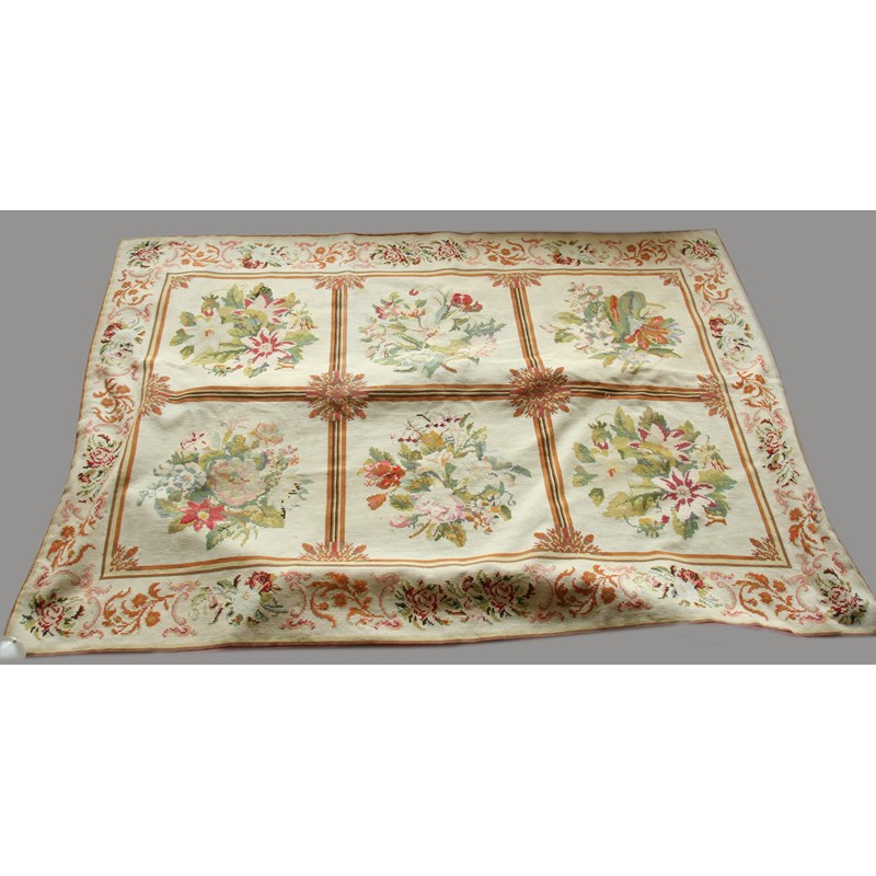 CROSS STITCH TAPESTRY, with six floral panels inside a scrolling foliate border, 190 x 135cm