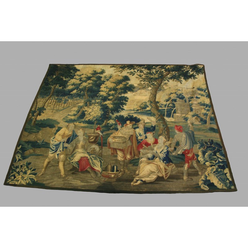 circa 1650-1700, probably Brussels, silk and wool, two ladies of the court with their attendants, ruins and wooded landscape beyond, 250cm x 340cm approximately
