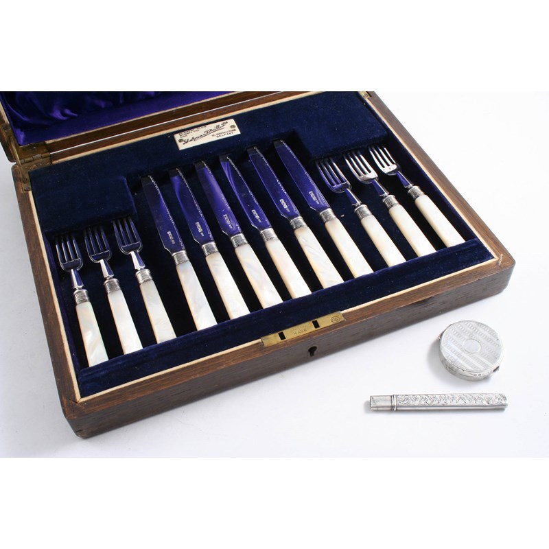 A CASED SET OF SIX MOTHER OF PEARL HANDLED FRUIT KNIVES & SIX FORKS maker's mark "A&D", Sheffield 1924/25 together with a portable fruit knife & a small circular compact; the latter 1.5" (4 cms) diameter (3)