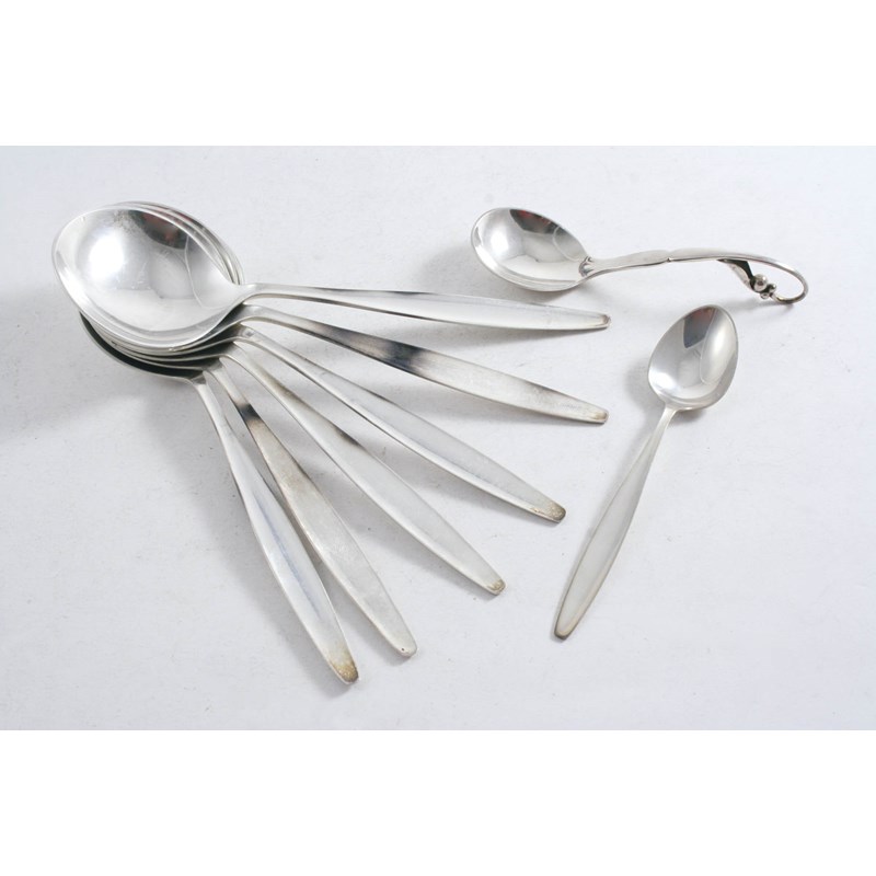 BY GEORG JENSEN: A set of six modern Danish Cypress pattern spoons and a matching tea spoon, together with another spoon with a curved stem & leaf terminal, same maker; the latter 4.4" (11.2 cms); 11.9 oz (8)
