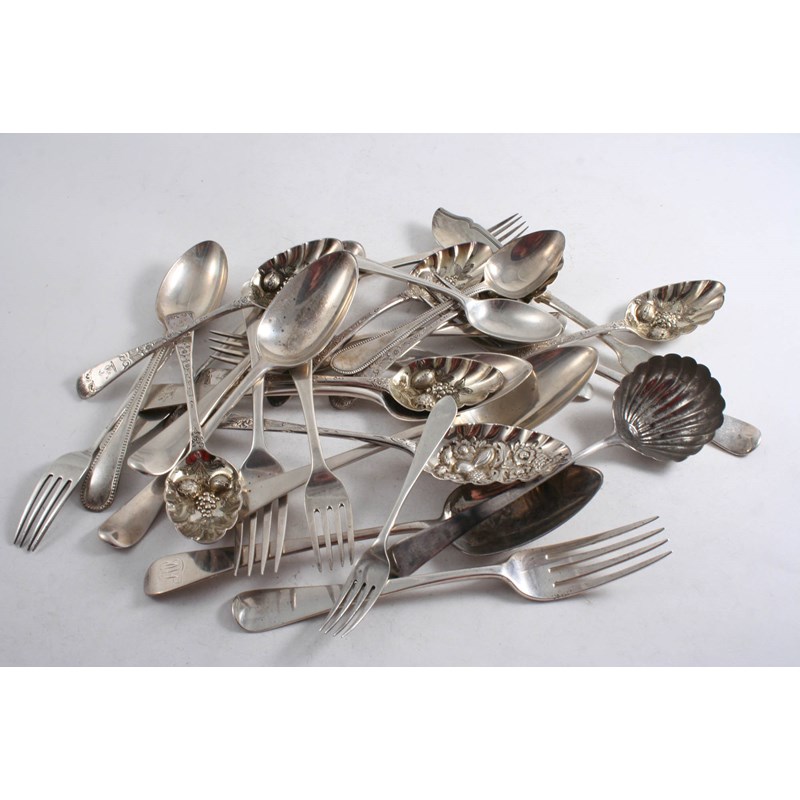 Six various antique table spoons, four table forks, nine dessert spoons, a sauce ladle, three butter knives & four small forks, various dates & makers; 41.5 oz (27)