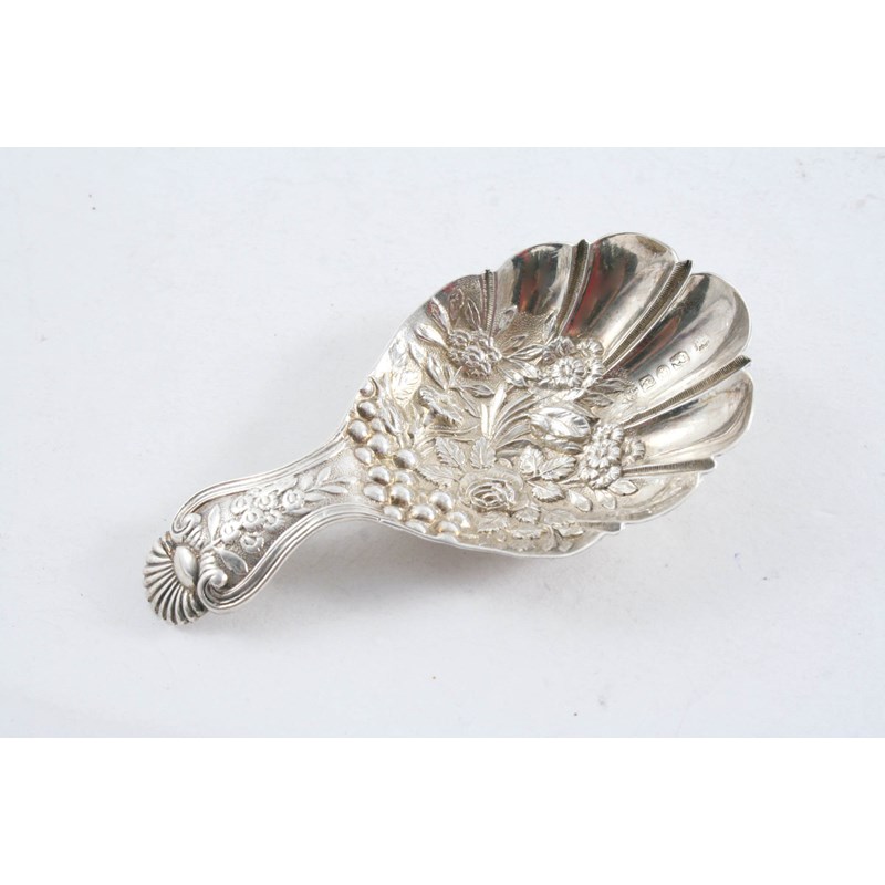 with a shell terminal, stamped in relief with various flowers & fruit, by Joseph Wilmore, Birmingham 1842; 3" (7.8 cms) long; 0.38 oz