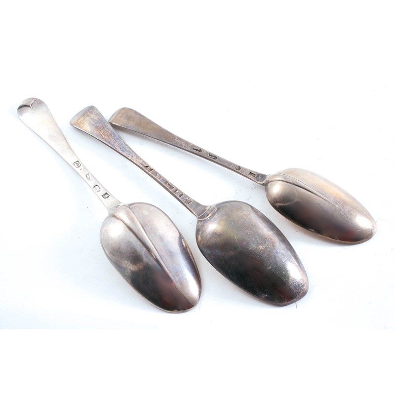 Hanoverian with a double drop bowl, scratched initials "S.T", by Pentecost Symonds, Exeter 1757 and two other George I table spoons; the former spoon 8.1" (20.5 cms) long; 5.75 oz (3)
