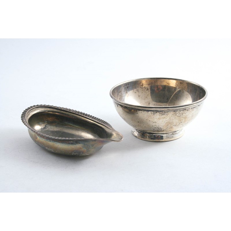 with a gadrooned border, by William Knight, London 1848 and a small modern sugar bowl by T. Rossi (of Norwich), London 1929; the latter 4" (10 cms) diameter; 6.25 oz (2)