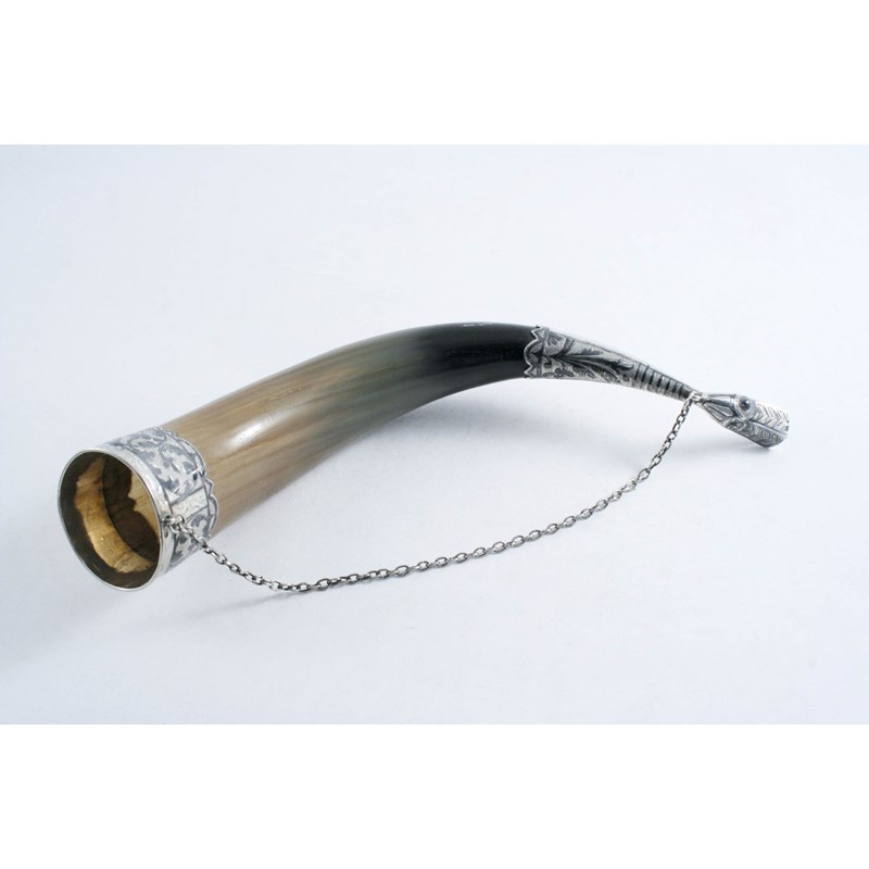 A 20TH CENTURY RUSSIAN PROVINCIAL, MOUNTED COW HORN DRINKING VESSEL with duck beak terminal, niellowork decoration & a suspensory chain, inscribed, post 1927; 11.75" (29.5 cms) long