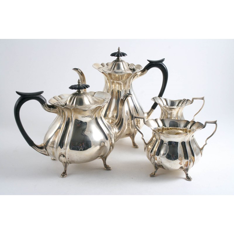 with fluted baluster bodies, each resting on four feet, by Walker & Hall, Sheffield 1912/15; the coffee pot 8.8" (22.7 cms) high; 61.7 oz (4)