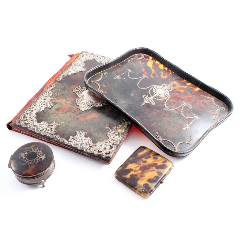 of shaped oblong outline, unmarked 1900-1910, a mounted tortoiseshell & leather blotter by William Comyns, London 1904, a jewel box (A/F) and a plastic cigarette case; the tray 11" (29 cms) long (4)
