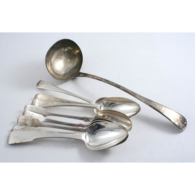 (including three Exeter-made examples) and a George III Old English pattern soup ladle by John Kerschner, London 1817; the latter 12.5" (31.5 cms) long; 22.5 oz (9)