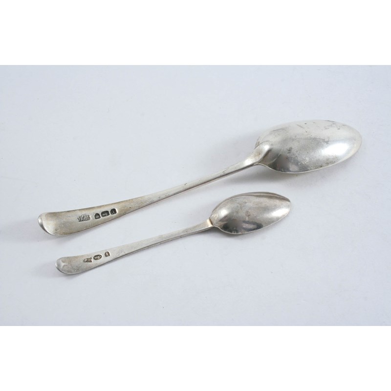 BY HESTER BATEMAN: An Old English pattern dessert spoon, crested, London 1781 and a bright-engraved tea spoon, initialled, London 1784; 1.45 oz (2)