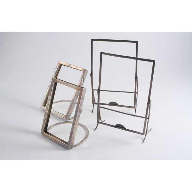 in the form of frames on stands, by E.H. Stockwell, London 1882 and a pair of Edwardian menu card holders, also in the form of frames, by D & J. Welby, London 1902; the larger pair 7.25" (18 cms) high; 10.6 oz (4)