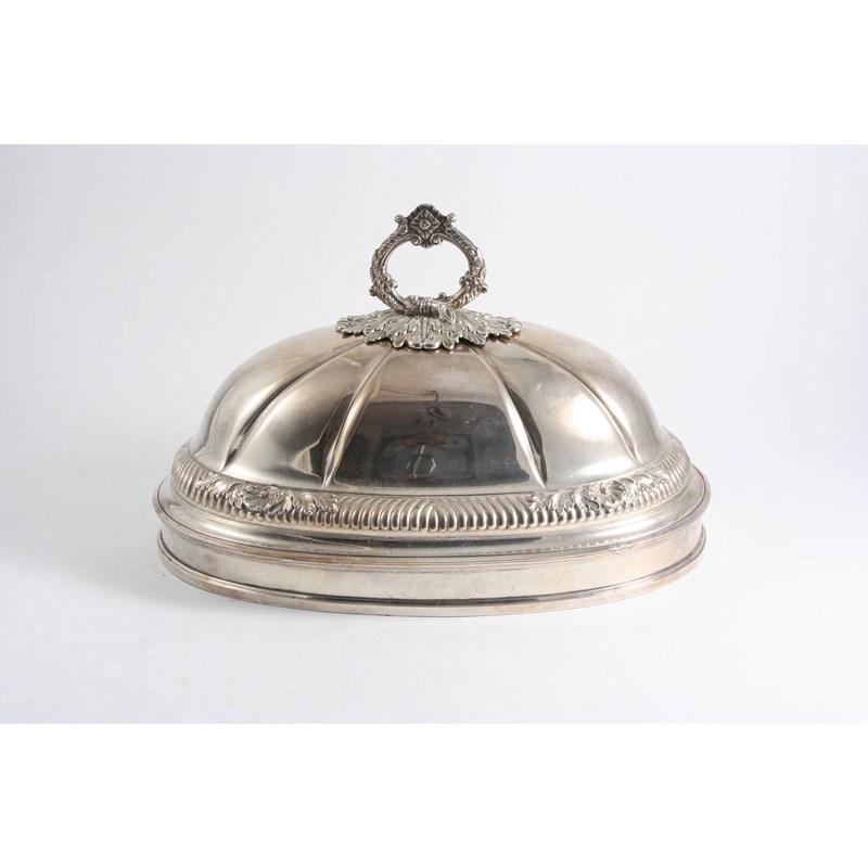 A SUITE OF FOUR MIDDLE PERIOD OLD SHEFFIELD PLATED OVAL MEAT DISH COVERS (a pair & two larger graduated), with borders of fluting & leafy shells, detachable handles, crested 1815-1820; the largest one 19" (48 cms) long (4)