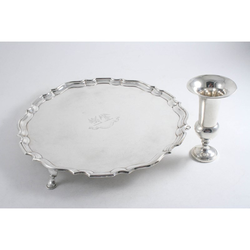 with a moulded b order, engraved crests & motto, maker's mark defaced, London 1906 and a small modern vase (loaded); the salver 12.25" (31 cms) diameter; 26.75 oz weighable silver (2)