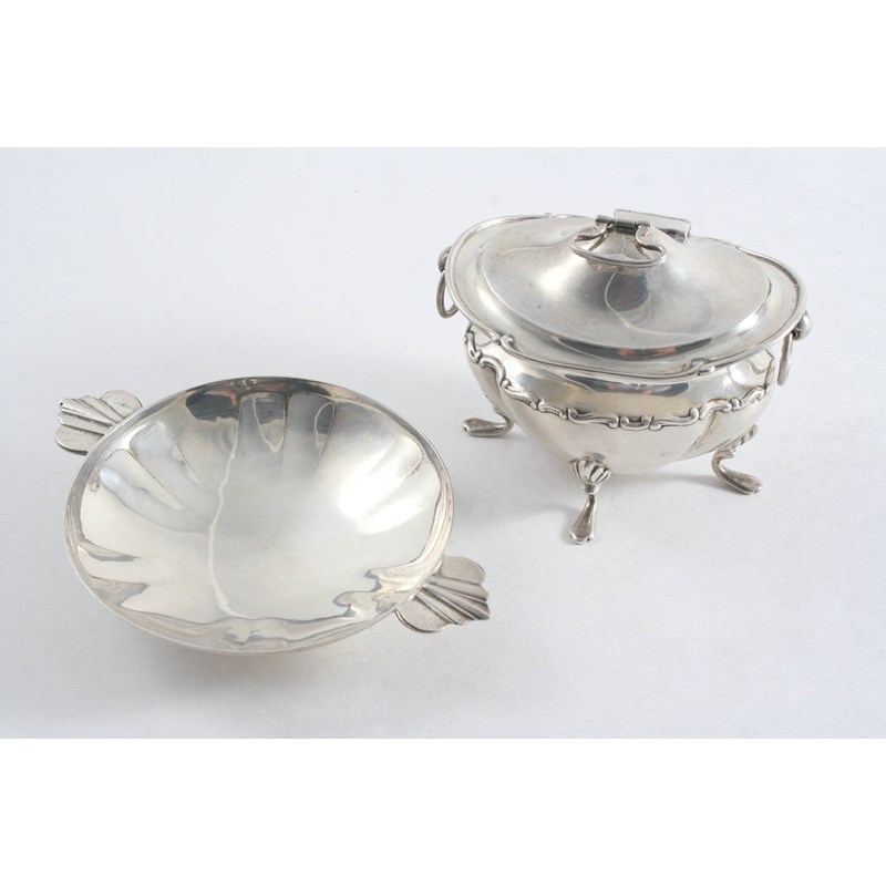 with ring handles & four feet, the domed cover with a swing finial, by Walker & Hall, Sheffield 1907 and a small dish with two lug handles, maker's mark "EB", London 1959; 8.25 oz (2)