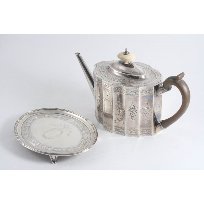 A GEORGE III SHAPED OVAL TEA POT & AN OVAL STAND both bright-engraved to match, the pot by Cornelius Bland, London 1788, the stand by Thomas Hannam & John Crouch, London 1788; the pot 5.5" (14 cms) high; 22.5 oz