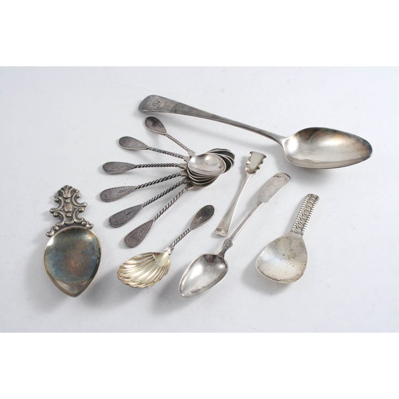 A George II salt shovel, crested, a set of six Victorian tea spoons & matching caddy spoon with "twist" stems by Messrs Lias, London 1875, a George III table spoon by Peter, Ann & William Bateman 1800, a handmade caddy spoon (unmarked), an Italian caddy spoon & a German tea spoon; 7.6 oz (12)