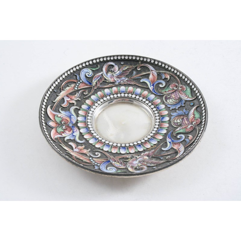 AN EARLY 20TH CENTURY RUSSIAN SAUCER decorated in shaded polychrome enamels, maker's mark distorted, with State marks for 1908-1917; 4.5" (11.5 cms) diameter; 3.1 oz