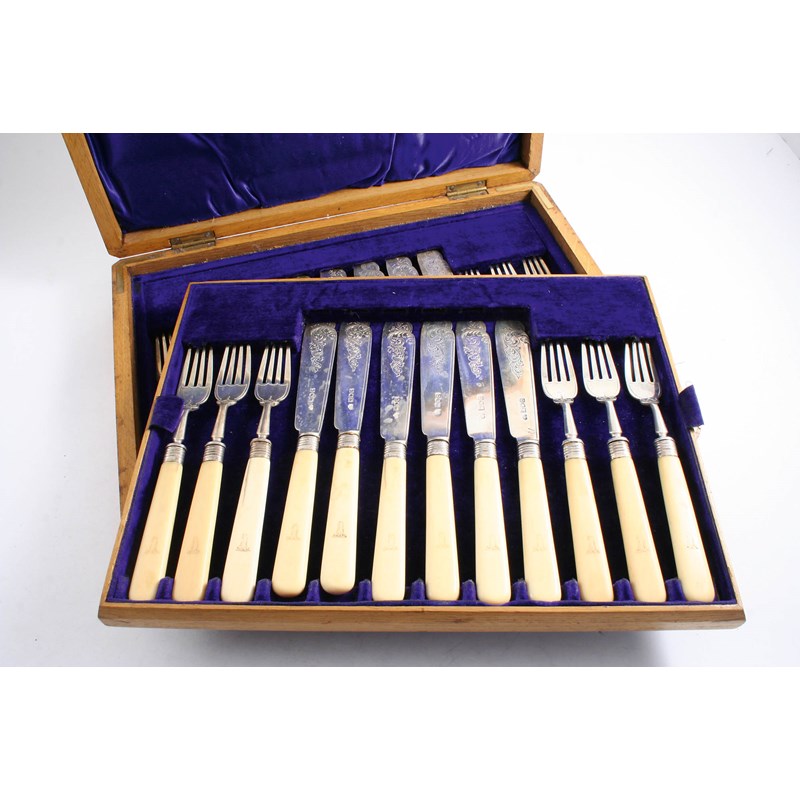 AN EDWARDIAN CASED SET OF TWELVE PAIRS OF IVORY HANDLED FISH KNIVES & FORKS with engraved blades & border-engraved tines, by the Goldsmiths & Silversmiths Co.Ltd., London 1909; the case 13.4" (34 cms) long