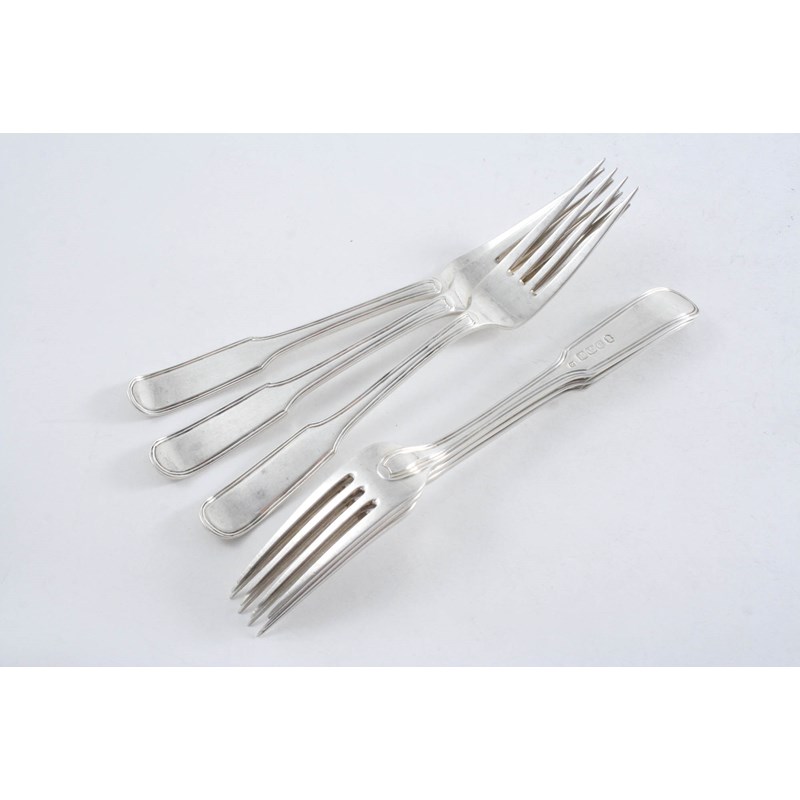 A SET OF SIX GEORGE III SCOTTISH DESSERT FORKS Fiddle & Thread pattern (with narrow, elongated "Fiddles"), probably by John Ziegler (maker's mark "Z"), Edinburgh, 1809/10; 9 oz (6)