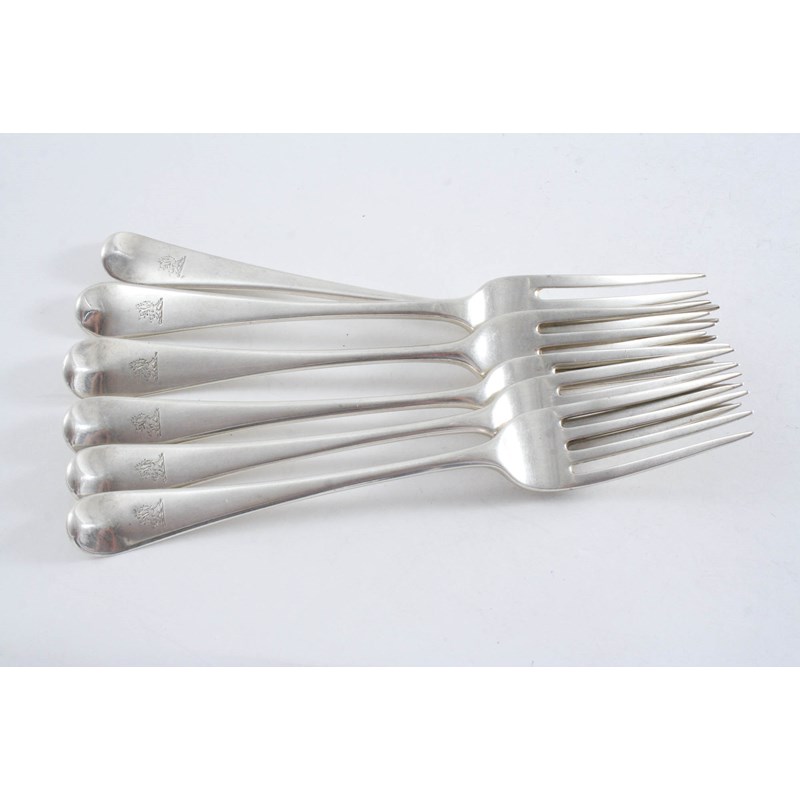 A MATCHED SET OF SIX GEORGE III / IV OLD ENGLISH PATTERN TABLE FORKS crested, by various makers, London 1791/1798/1820; 13.6 oz (6)