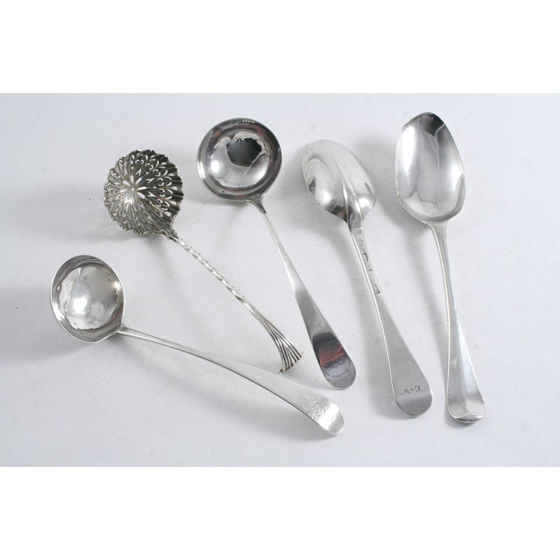 A George I Hanoverian table spoon with a plain rattail, London 1715, a George II table spoon, two George III Scottish sauce ladles, crested & a Victorian sugar sifter ladle; the latter 6.4" (16 cms) long; 6.6 oz (5)