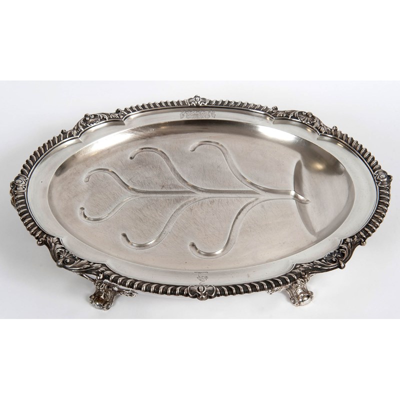 of shaped oval outline with a gadroon & foliate shell border, a "tree & well" centre & two large button feet, engraved coat of arms & crest by John S. Hunt, London 1852 complete with plated warming base; the dish 23" (58.5 cms) long; 115 oz weighable silver