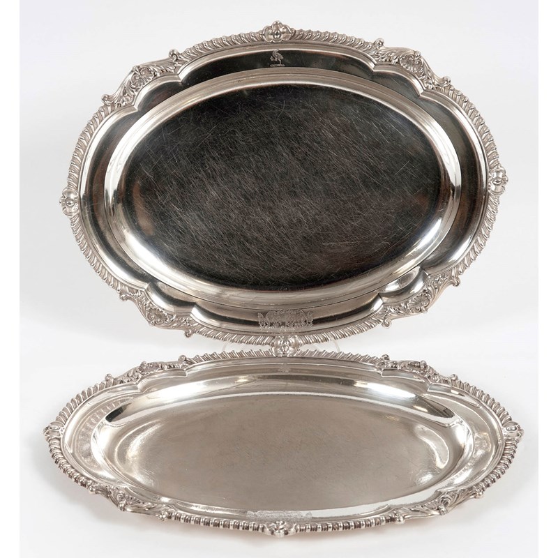 of shaped oval outline with gadroon & foliate shell borders, engraved crests & coats of arms, by John S. Hunt, London 1852; 16.2" (41.5 cms) long; 79.4 oz (2)