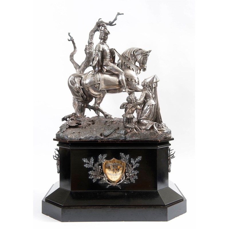 A large Victorian parcelgilt trophy or centre piece, cast romantically in the form of a chivalrous medieval gentleman mounted on a fine stallion & looking upon a young lady crouching before him and holding a boy who appears to be anxious, as if awaiting a decision from the two adults, these figures bolted to an electroplated, brass, rockwork base with ferns growing at the base of a wind-shaped, leafless tree & resting on a painted & bevelled wooden plinth with plated mounts & a gilt shield, inscribed "Northampton 1870 won by compromise - 4 years", the silver hallmarked by Frederick Elkington, Birmingham, 1869, contained in a large oak travelling case; the centrepiece 22.7" (57.5 cms) high; the plinth 23.75" (60.5 cms) long; 137 oz weighable silver