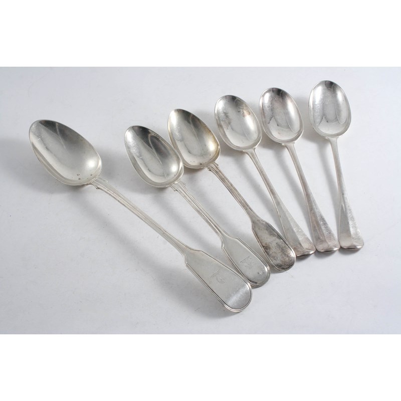(single struck) and matching table spoon, crested, London 1832 together with another table spoon and three plated table spoons; the baster 11.75" (30 cms) long; 9.5 oz weighable silver (6)