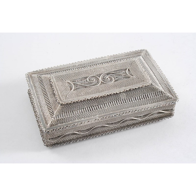 A CONTINENTAL FILIGREE WORK BOX on four stud feet, with a bevelled cover, struck with three indistinct marks, probably late 19th century; 4.7" (11.8 cms) long; 4.3 oz