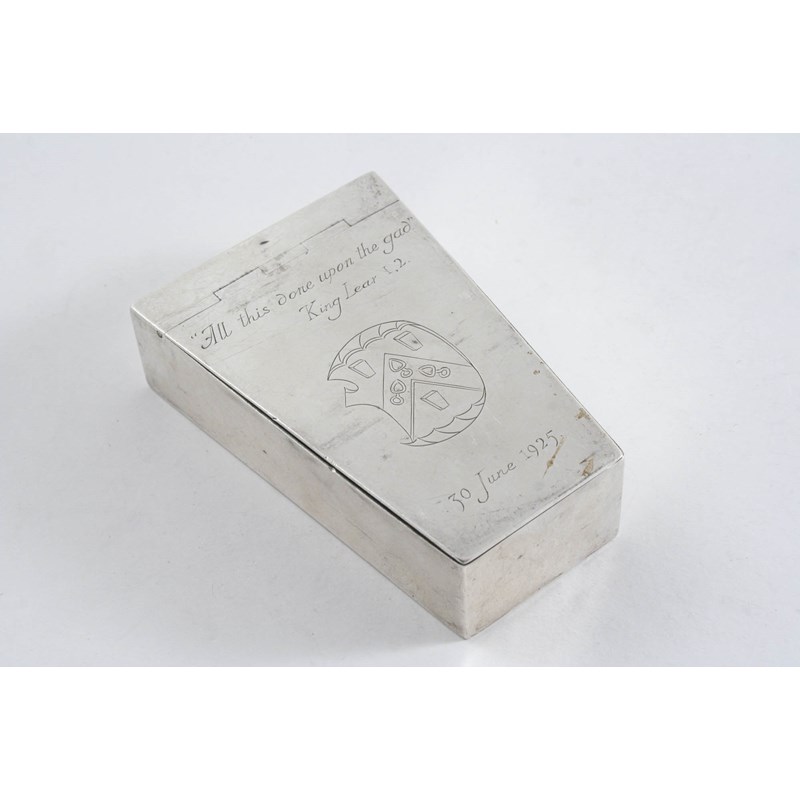 with a concealed hinge, engraved on the cover with a stylised coat of arms & inscribed "All this done upon the gad, King Lear 1, 2. 30th June 1925" by H. Wilkinson, Sheffield 1924; 3.55" (9 cms) long; 3.75 oz