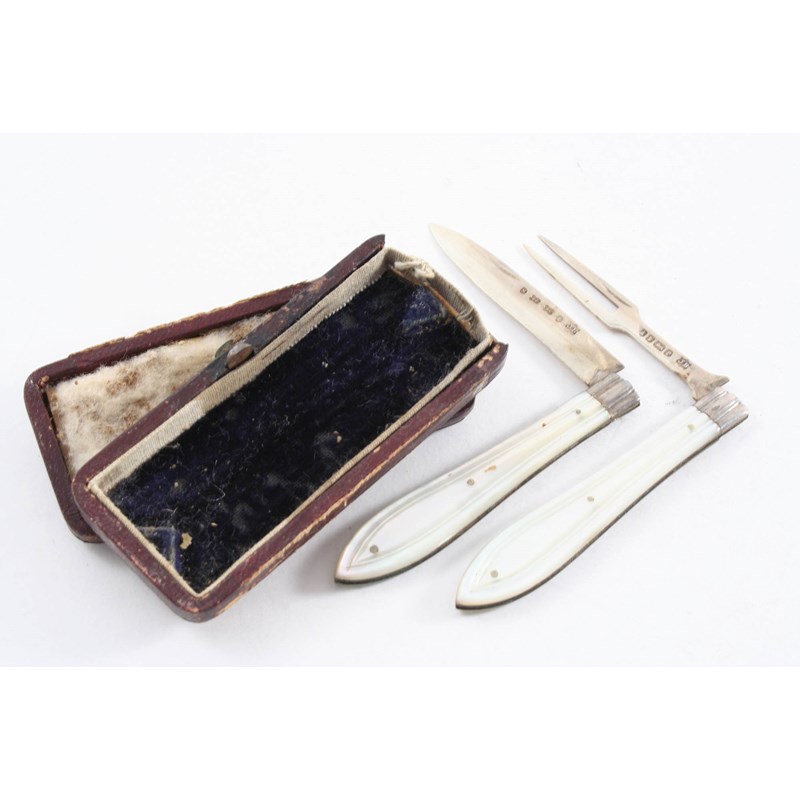 A VICTORIAN MOTHER OF PEARL MOUNTED FOLDING FRUIT KNIFE & MATCHING FORK maker's mark "JB", Sheffield 1860/66 (cased); 3" (7.5 cms) long each (closed)