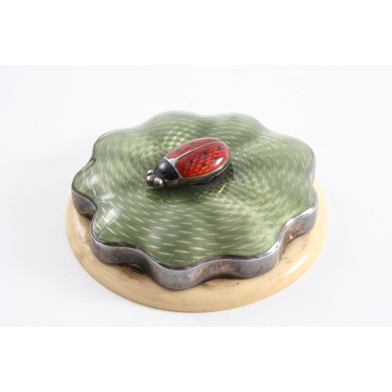 in the form of a ladybird on a stylised leaf with a wavy border, decorated with red, black & green enamel, on a simulated ivory base, maker's monogram "SA" or "AS", probably Austro-Hungarian 1920-30; 2.55" (6.6 cms) diameter