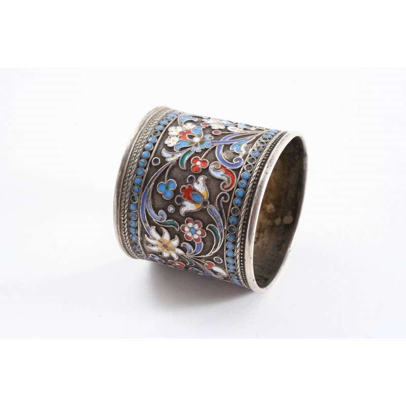 A RUSSIAN CLOISONNE ENAMEL NAPKIN RING decorated in polychrome, with state marks for 1908-1017 (88 zolot nicks); 2" (5 cms) diameter; 1.25 oz