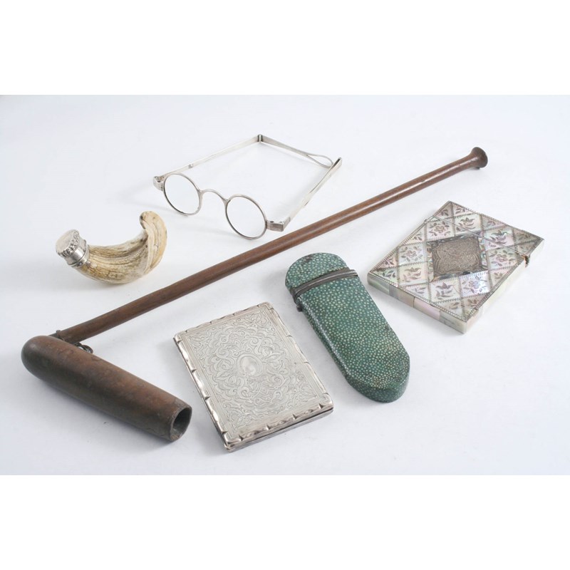 A 19th century mounted boar tusk snuff mull, a Victorian engraved note case, a mother of pearl card case A/F, a mounted shagreen case (A/F), a pair of antique spectacles & a wooden pipe; the latter 15" (38 cms) long (6)