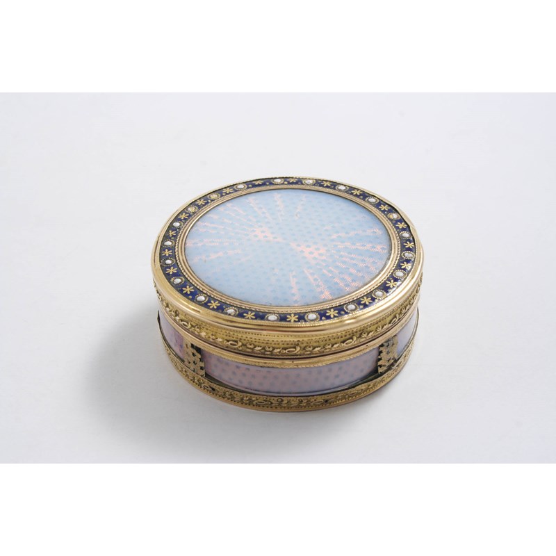 A LATE 18TH / EARLY 19TH CENTURY GOLD & ENAMELLED CIRCULAR SNUFF BOX & COVER (A/F); 2.5" (5.8 cms) diameter