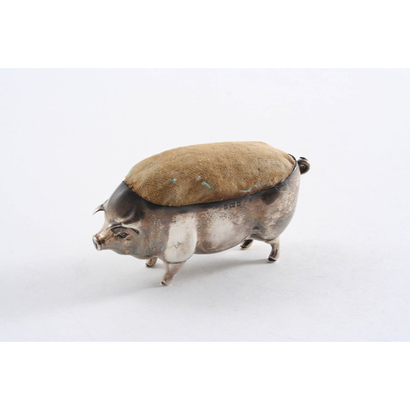 AN EDWARDIAN NOVELTY PIN CUSHION in the form of a standing pig, by Walker & Hall, Birmingham 1903; 4.4" (11 cms) long