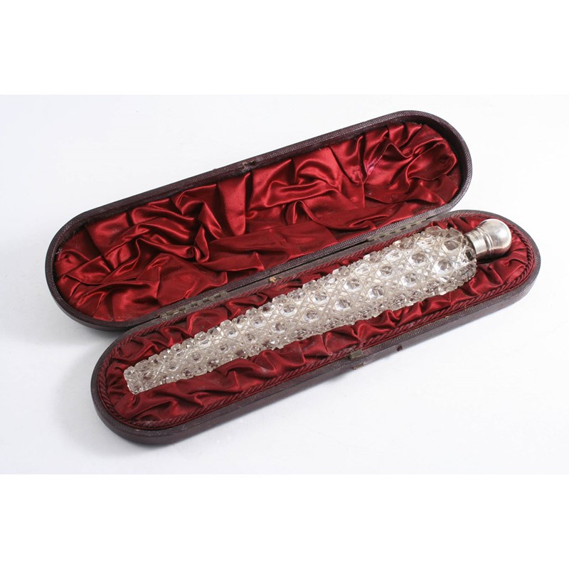 A VICTORIAN MOUNTED CUT GLASS SCENT FLASK with a long tapering body & a bulbous screw cap (in a lined & fitted case), maker's mark worn, London 1883; 11" (28 cms) long