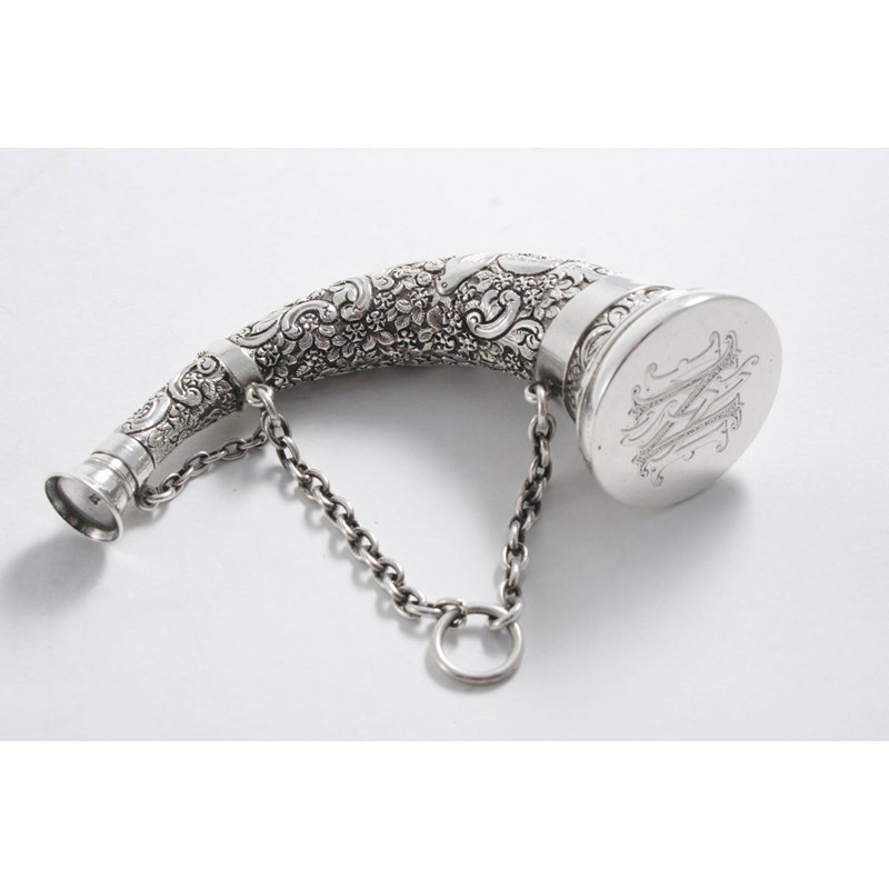 in the form of a horn with chased decoration & a suspensory chain, the main cover hinged to reveal the vinaigrette, the screw cap at the other end for scent, monogrammed, by Sampson Mordan, London 1873 (with incuse registered design lozenge & retailer's mark of "Thornhill"); 4.5" (11.4 cms) long; 2.1 oz