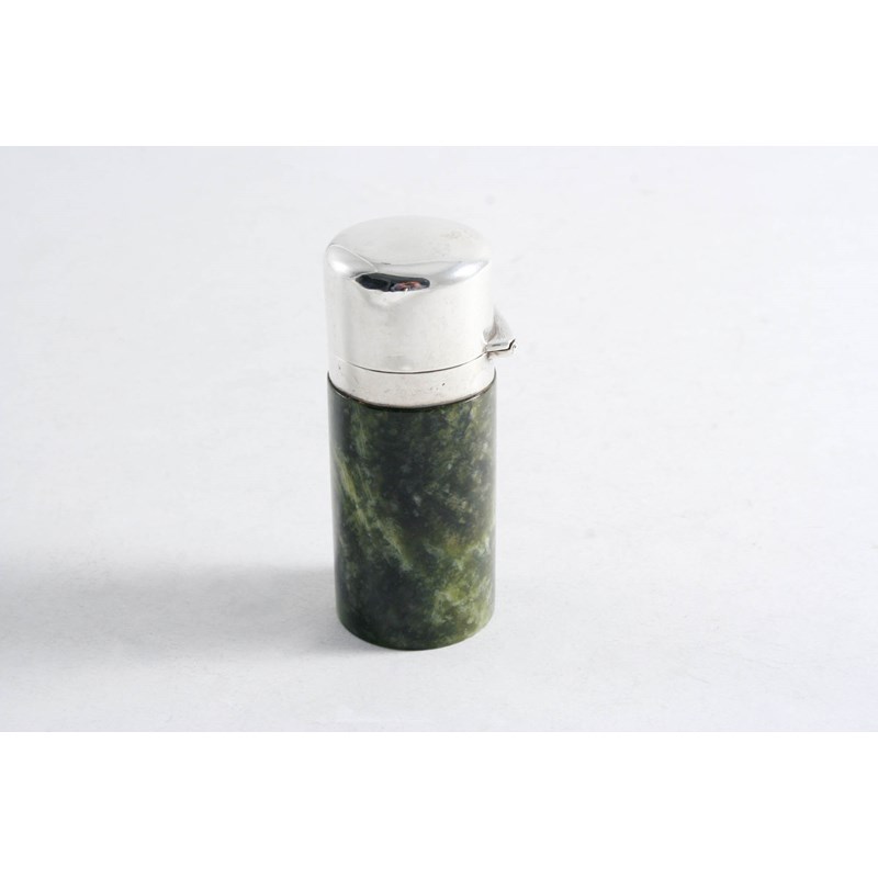 A LATE VICTORIAN MOUNTED "CONNEMARA MARBLE" SMELLING SALTS/SCENT BOTTLE with a plain, hinged cover & a ground marble stopper by Sampson Mordan & Co., London 1898; 3.1" (8 cms) high