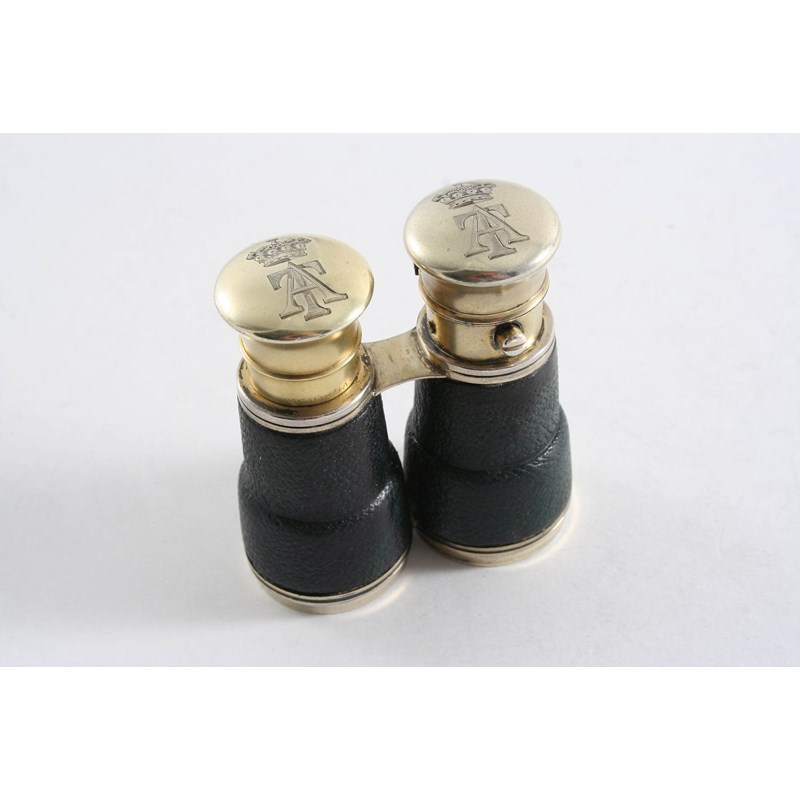A VICTORIAN SILVERGILT MOUNTED GILT METAL NOVELTY DOUBLE SCENT BOTTLE in the form of a pair of opera glasses with dark green glass & dark green leather cladding, each cover (one screw cover & one sprung) engraved with a monogram below a Baron's coronet, incuse marks for Sampson Mordan, 1850-60; 2.5" (6.5 cms) high