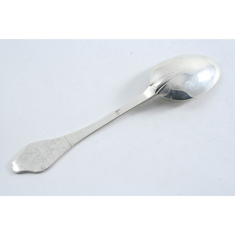 with a thread-bordered rattail & an engraved crest above the initials "AV", maker's mark only "IB", possibly Amercian by Jacob Boelen, New York, 1710-20; 7.5" (19 cms) long; 1.57 oz