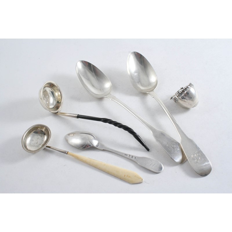 Two antique table spoons (with re-shaped stems), a Canadian Fiddle tea spoon, a Scottish toddy ladle by J. Mackay, Edinburgh 1857, another toddy ladle & a Continental tea strainer; 4.75 oz weighable silver (6)
