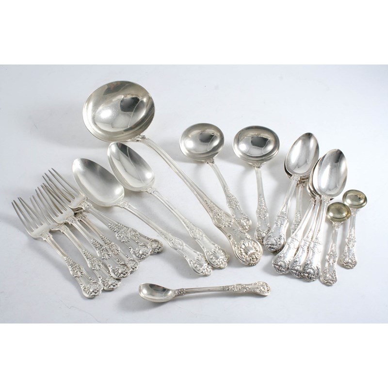 A PART SERVICE OF GEORGE IV / WILLIAM IV QUEEN'S PATTERN (HONEYSUCKLE HEEL) FLATWARE: