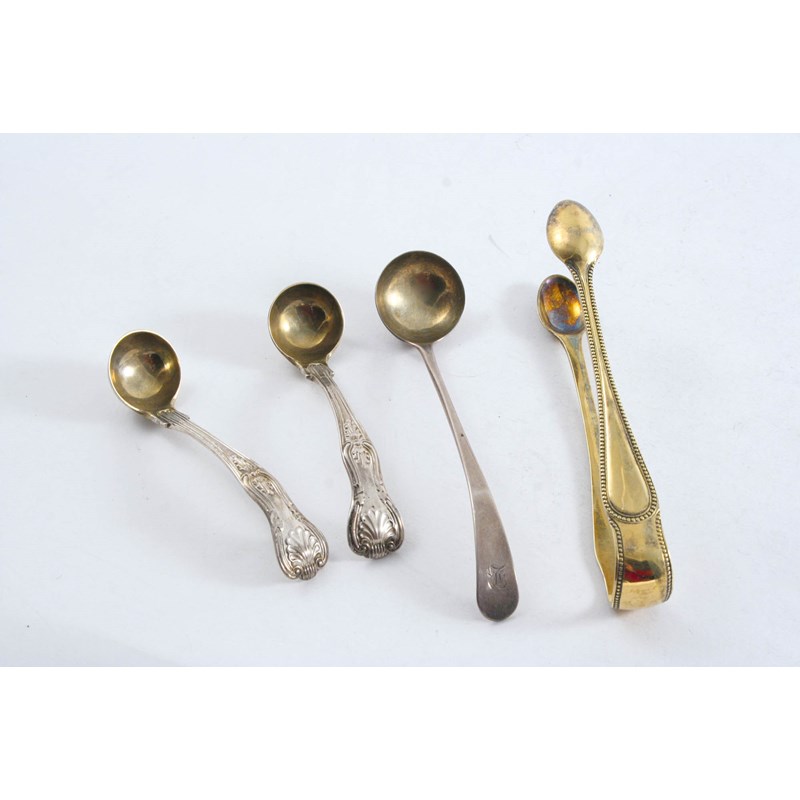 by George Adams, London 1864, a George III provincial cream or condiment ladle, gilt bowl, initialled "B", by Thomas Graham (of Bath), London 1792 & a pair of Victorian silvergilt, Bead pattern sugar tongs; the ladle 5" (12.7 cms) long; 2.8 oz (4)