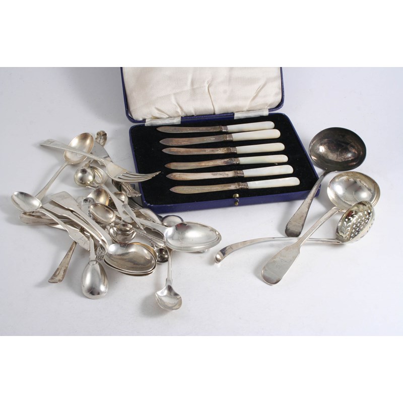 A cased set of six modern tea knives (mother of pearl handles), six various condiment spoons, four egg spoons, a mustard spoon, a butter knife, seven tea spoons, four Fiddle pattern dessert spoons, two sauce ladles, a sugar sifter ladle & a dessert fork; 21.25 oz weighable silver (lot)