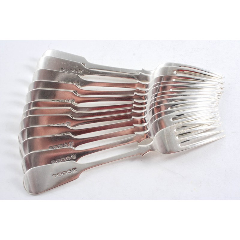 A SET OF TWELVE VICTORIAN FIDDLE PATTERN TABLE FORKS initialled "H", by James & Josiah Williams, Exeter 1863; 27.75 oz (12)