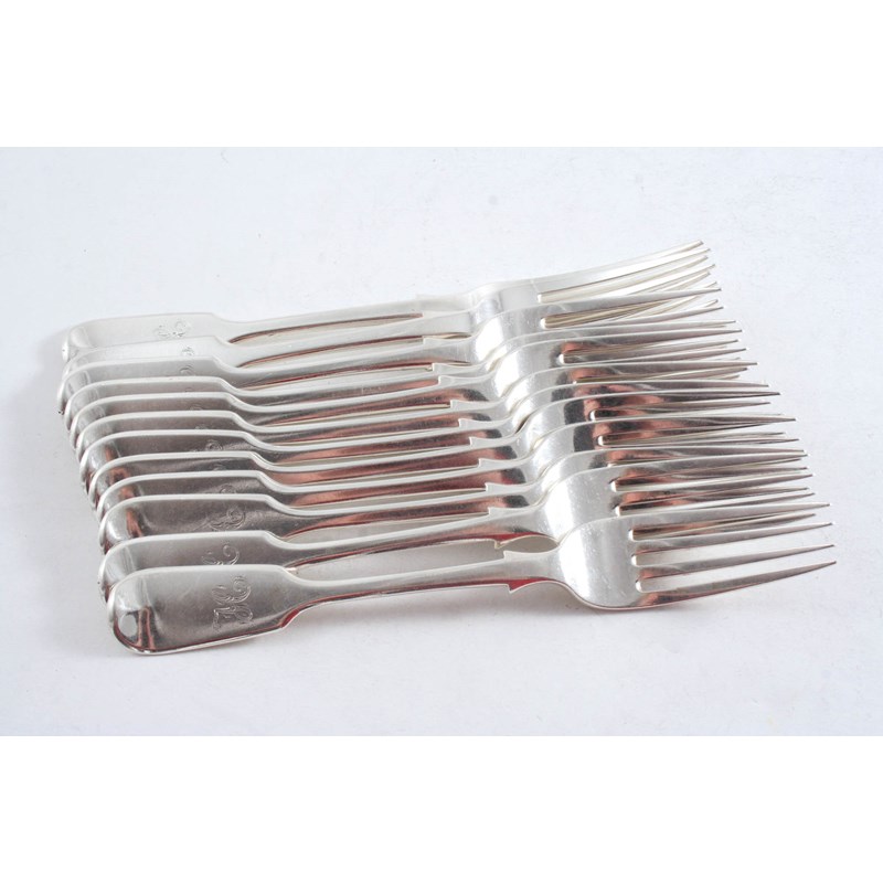 A SET OF TWELVE VICTORIAN FIDDLE PATTERN DESSERT FORKS initialled "H", by James 7 Josiah Williams, Exeter 1863; 19.8 oz (12)