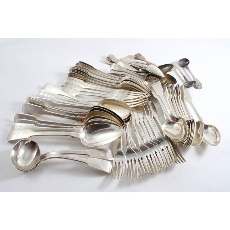 Twelve table spoons, thirteen table forks, a set of ten dessert forks, a set of ten dessert spoons, sixteen tea spoons, two salt spoons, and a pair of sauce ladles, all crested, (two different crests) by various makers, mixed dates, London 1814-1836; 117.3 oz (65)
