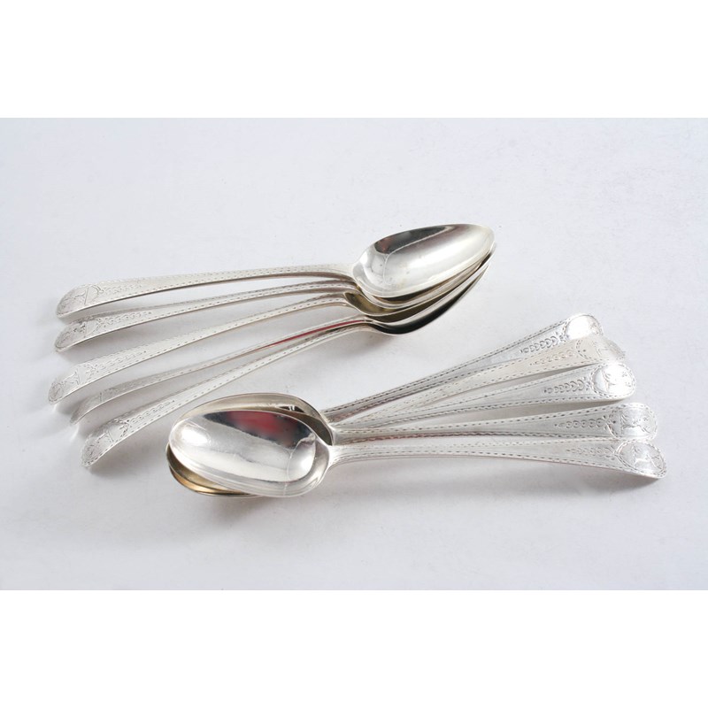 A MATCHED SET OF TEN GEORGE III OLD ENGLISH PATTERN DESSERT SPOONS with bright-cut decoration, crested, by two makers (WC and IS), London 1779/80; 10.4 oz (10)