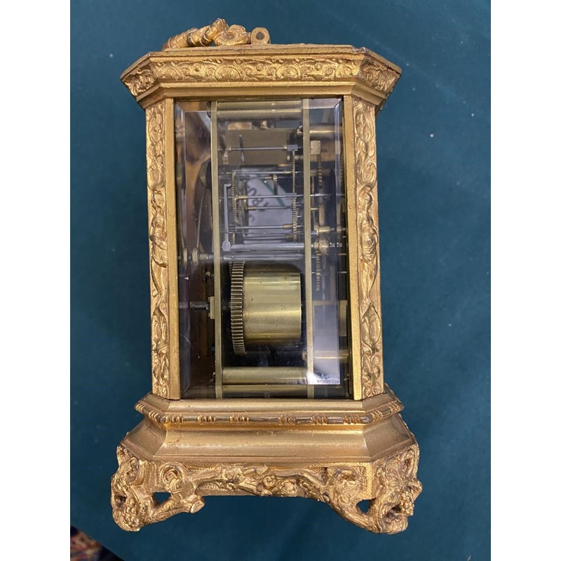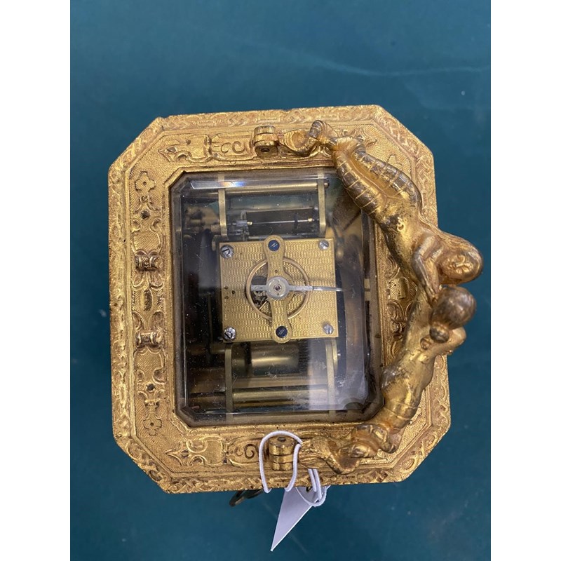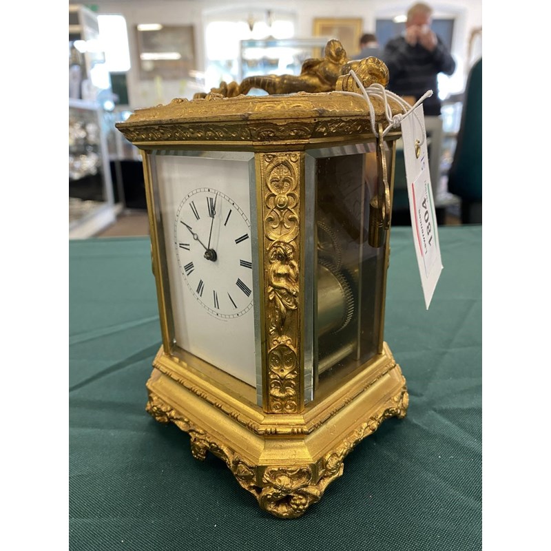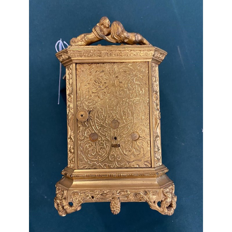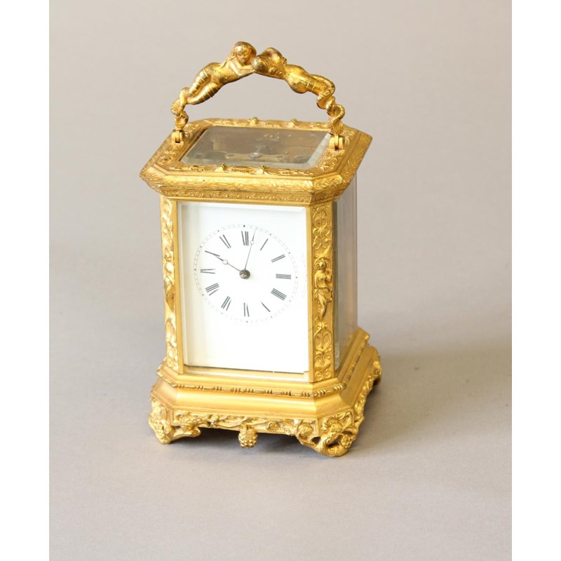 A GILT BRASS CASED CARRIAGE CLOCK BY BOLVILLER OF PARIS. With a rectangular white enamelled dial with Roman numerals, with a two train eight day movement striking on a bell, the back plate and case numbered 611 in various places, the elaborate cast case with all over scrolling and figural decoration, the base adorned with hanging bunches of grapes, the back door with all over strapwork decoration, and the handle in the form of two entwined mermaids, 21cm high (with handle up) 12cm wide and 11cm deep. With key.